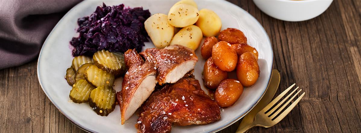 valgfri forret & dessert. dressing og brød med til & tilbehør. sovs kan tilkøbes.